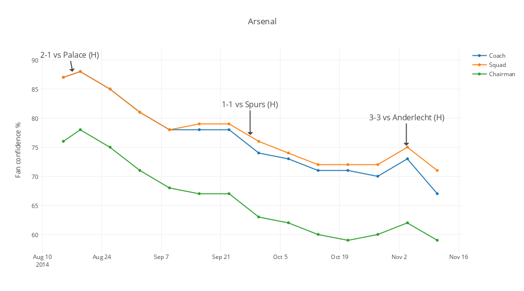 The interesting thing about the Gunners stats is that until September 9th, confidence in the squad and the manager dropped at the exact same rate. After the chastening, shadow-chasing Borussia Dortmund Champions League defeat on September 16th, however, the fans lost faith in Arsene Wenger at a slightly faster rate – he now has a 67% confidence rating, to his squad’s 71%.
