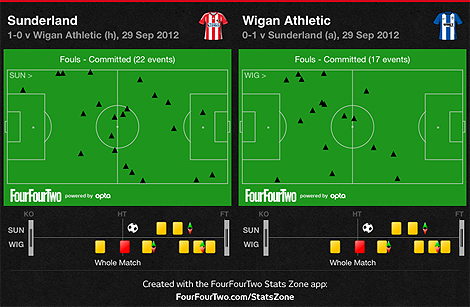 Perhaps not the fixture you'd pick for a kickathon, but an eventually crucial three points - the margin by which the Mackems finished above the Latics. Howard Webb got busier as the game went on: Sunderland's 22 fouls were evenly divided between the halves, but Wigan upped their game from 6 first-half fouls to 11 after the break. One of them was Jordi Gomez's 48th-minute foul on Danny Rose, which drew a red card: in total, an increasingly weary Webb also brandished 7 yellows, 5 of them for visitors - and all but one after the Gomez red. Can't say he didn't warn you, Wigan.