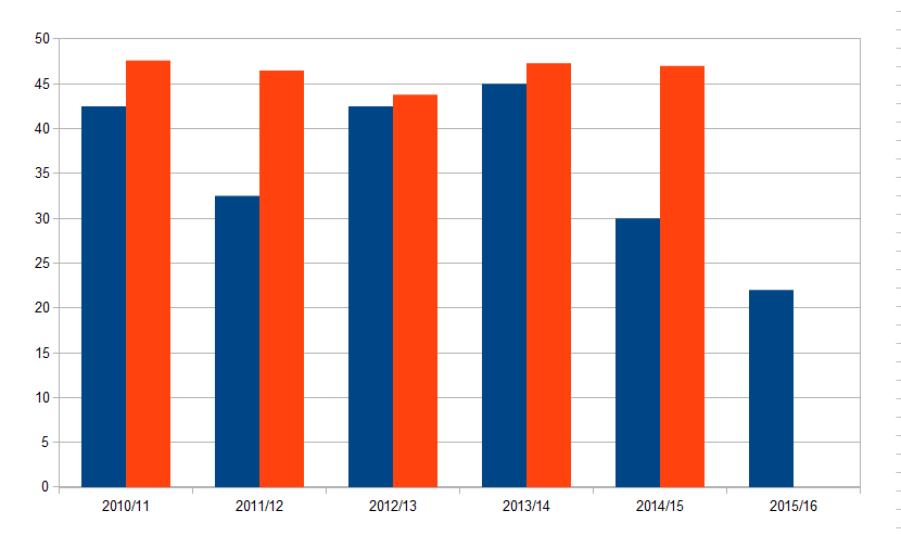 Furthermore, as the table below illustrates, in each of the last five seasons the percentage of home wins in the opening four rounds (blue bar) has been significantly lower than in the remaining 34 fixtures (red bar).